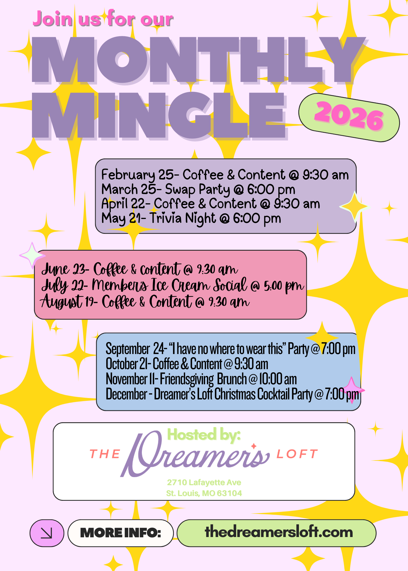 At The Dreamerβs Loft, thereβs always something going on! From community meet-ups, events weβre hosting for members and non-members, or private parties, thereβs no space quite likes ours to get inspired and celebrate! Check out the calendar below for both public and private events - click into the link for more info on whatβs going on and how you can be a part of it! Save the date