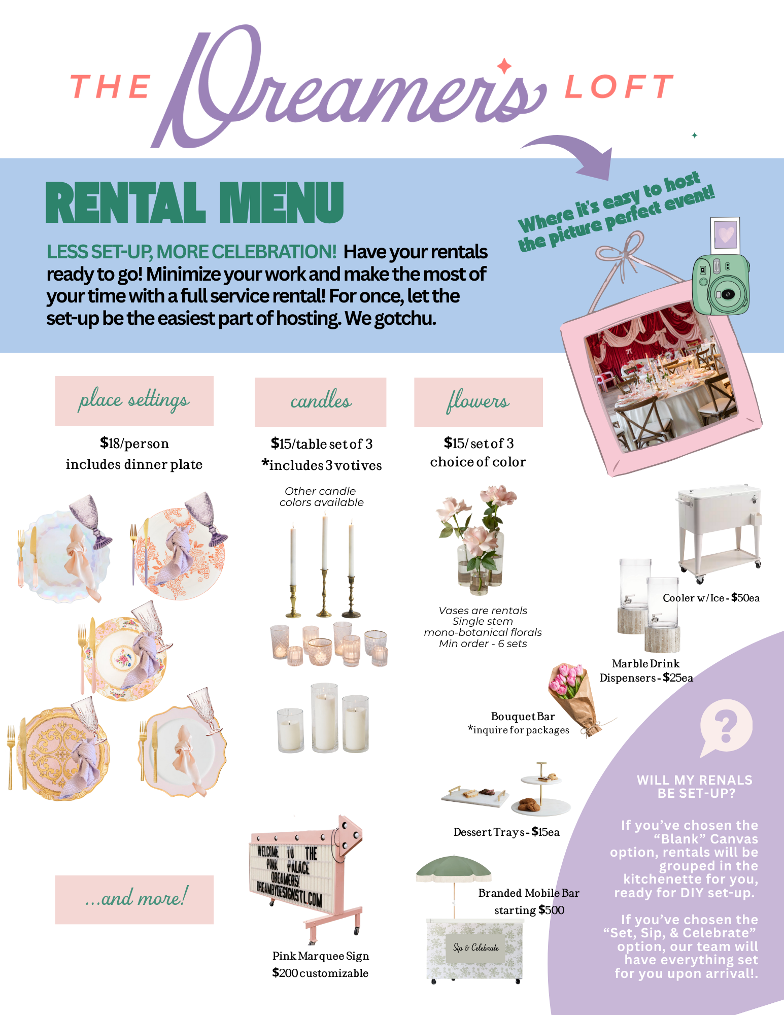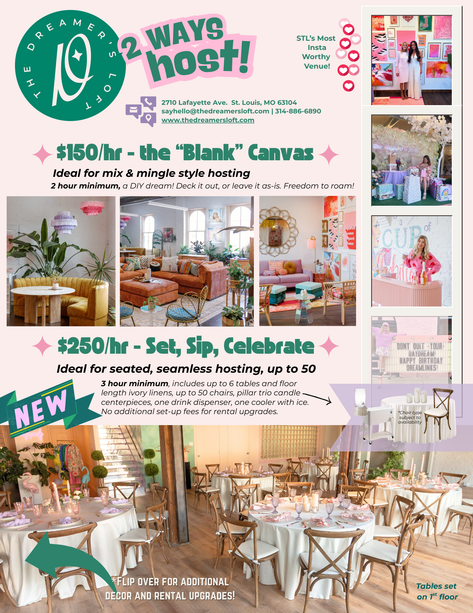 Let the set-up be the easiest part. Take all the credit and do none of the work. There is nothing that would make us happier. Host two ways at The Dreamer’s Loft! *inquire below